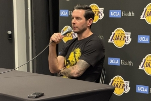 赛前湖人主帅雷迪克穿了一件定制的艾顿球衣出席了新闻发布会,这件球衣正面是艾顿的脸和狮子的图案拼接而成。