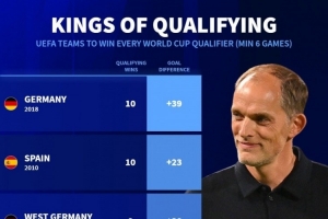德国转会市场盘点了单届欧洲世预赛全胜球队,德国、西班牙、英格兰、荷兰在列。