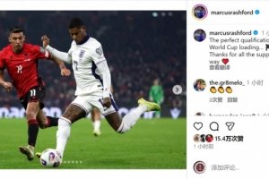 拉什福德社媒晒出比赛照片,并写道:“完美的世预赛之旅!世界杯即将到来,感谢大家一路以来的支持。”