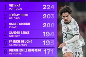 体育资讯11月20日讯 本届世欧预小组赛已经告一段落,squakwa也统计了本届赛事在进攻三区的成功传球情况,维蒂尼亚居首。