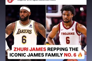 詹姆斯转发了媒体晒出的他和三个子女都身穿6号球衣的照片。詹姆斯的两个儿子布朗尼和布莱斯在大学打篮球时都身穿6号球衣,女儿Zhuri在学校打排球时身穿6号球衣。詹姆斯本人在热火和湖人也有6个赛季身穿6号球衣。