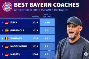 体育资讯11月27日讯 拜仁在本轮欧冠焦点战客场1-3不敌阿森纳,遭遇赛季首败。《转会市场》统计显示,孔帕尼同期执教数据依然位列拜仁队史前茅。