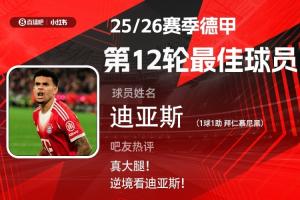 第12轮评选结果结出炉,迪亚斯传射建功,帮助拜仁补时逆转圣保利,获得吧友超3.6万票支持,当选【体育资讯X小红书德甲第12轮最佳球员】!