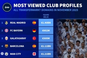 体育资讯12月3日讯 德转列出了11月份俱乐部页面浏览量排名,皇马、拜仁、加拉塔萨雷前三。