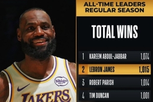 据NBA官方统计,这是詹姆斯生涯第1015场常规赛胜利,超越“酋长”帕里什,升至NBA历史第二位,仅次于“天勾”贾巴尔的1074场。