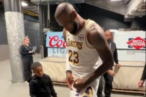 赛后,一位小球迷拿着詹姆斯的球衣,后者在球员通道送上签名。