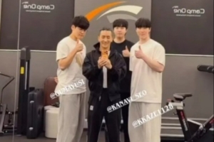 体育资讯12月8日讯 健身三人组😋健身教练分享与Gumayusi、Kanavi、Zeka合照。