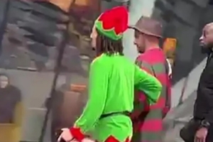 沃克身着经典电影角色弗莱迪·克鲁格服装,被拍到在街头脚步不稳,需要由装扮成“精灵”的22岁队友汉尼拔以及一名安保人员共同搀扶,才能返回下榻酒店。