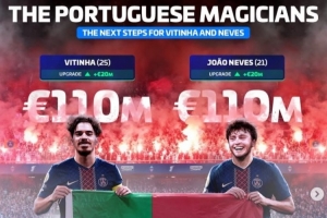25岁的维蒂尼亚本赛季26场已贡献6球10助攻、21岁的若昂·内维斯20场贡献8球3助攻,两人的身价均上涨2千万欧元,达到1.1亿欧元。
