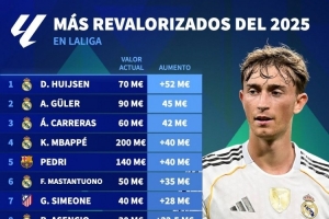 体育资讯12月24日讯 德国转会市场列出了2025年西甲球员身价上涨排名,赫伊森上涨5200万欧居首,居莱尔上涨4500万欧次席。