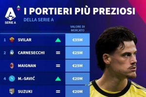 体育资讯12月25日讯 德国转会市场列出意甲门将身价排名,斯维拉尔3500万欧居首。