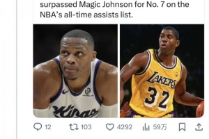 最近,国王后卫威斯布鲁克在历史助攻榜上超越魔术师约翰逊,升至历史第七。