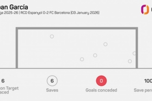 据Opta统计,霍安·加西亚本场比赛做出6次扑救,2023年11月特尔施特根对阵皇家社会之后,他是首位西甲单场6次扑救+零封的巴萨门将。