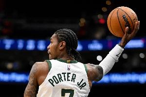 雄鹿球员小波特上半场虽然失误略多,但总体表现还不错,进攻效率挺高。
