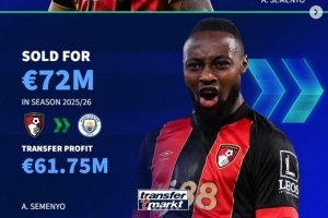 塞梅尼奥:1025万从布里斯托尔城引进,7200万出售给曼城,盈利6175万