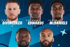 本场比赛森林狼首发名单:爱德华兹、迪文岑佐、麦克丹尼尔斯、兰德尔以及戈贝尔。