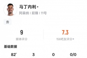 体育资讯1月11日讯 足总杯第3轮,阿森纳客战朴茨茅斯。马丁内利首发出战,上演帽子戏法,还有1次射中门框,2次错失进球机会,评分9.0。
