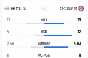 体育资讯1月18日讯 本轮德甲,拜仁5-1逆转客胜双杀莱比锡。双方全场重点数据对比如下↓(主队莱比锡在前)