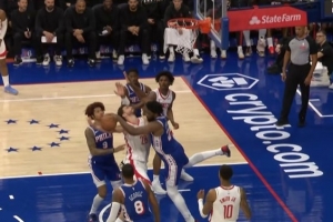 GIF-申京造恩比德犯规 76人挑战成功