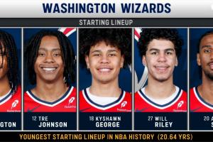 奇才首发:卡林顿(20岁188天)、特雷·约翰逊(19岁324天)、凯肖恩·乔治(22岁44天)、威尔·莱利(19岁349天)、萨尔(20岁274天)