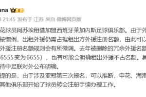 去年被删除的冗余外援名额很可能重新回归(即从6555变为6655),也有可能会明确租出外援不占名额。具体是何种情况,还需等待中足联对外公布明确。