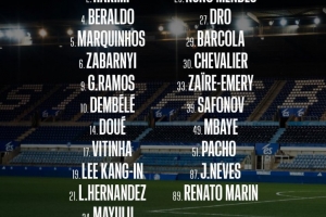 后卫:2-阿什拉夫、4-贝拉尔多、5-马尔基尼奥斯、6-扎巴尔尼、21-卢卡斯·埃尔南德斯、25-努诺·门德斯、51-威廉·帕乔