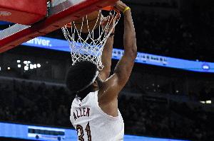上半场比赛,骑士中锋贾勒特·阿伦发挥出色,面对克林根防守各种篮下终结十分高效,他出战16分钟,15中12,三分1中0,罚球4中1砍下25分10篮板2助攻1抢断2盖帽,正负值+9。