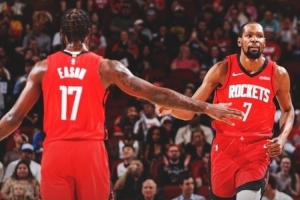 赛后火箭官方发布赢球海报,杜兰特和伊森击掌瞬间成为封面。