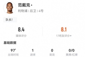 体育资讯2月12日讯 利物浦在本轮英超对阵桑德兰,范戴克本场数据如下: