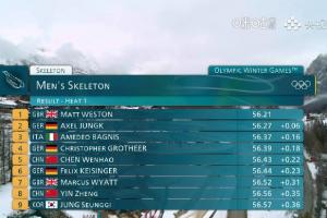体育资讯02月12日讯 米兰冬奥会男子钢架雪车第1组比赛结束,总计有24位选手参赛。中国选手陈文浩用时56.43秒,排名第5;殷正用时56.56秒,排名第8;林勤炜用时56.89秒,排名第12。