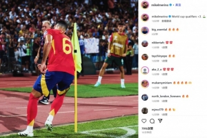 他也在赛后通过社媒晒出了自己的招牌绕角旗杆庆祝照,并配文:“世预赛+3分!⛳️”