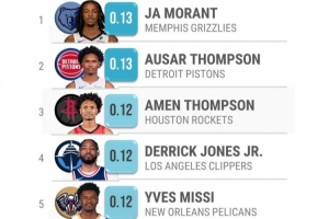 美媒统计了上赛季球员滞空时间在上场时间中所占的比例,其中莫兰特0.13%排名第一,奥萨尔-汤普森第二,阿门-汤普森第三,杰伦-格林第六,爱德华兹第七。