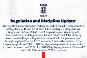 英格兰足球总会今日对切尔西足球俱乐部提出指控,其违反《英足总足球经纪人条例》J1和C2条款、《英足总中介合作条例》A2和A3条款,以及《英足总第三方球员投资条例》A1和B3条款。切尔西俱乐部共面临74项指控,涉及2009年至2022年期间的违规行为,主要集中于2010/11至2015/16赛季期间。切尔西俱乐部需于2025年9月19日前就此作出回应。