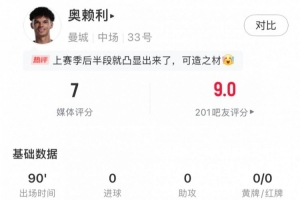 体育资讯9月15日讯 英超第4轮曼市德比,曼城主场3-0击败曼联,奥赖利此役出任曼城左后卫打满全场,球员数据如下: