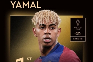 体育资讯9月23日讯 2025年金球奖颁奖典礼,亚马尔获科帕奖,连续两年获此荣誉。