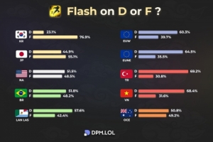 其中韩服F闪玩家高达76.9%,D闪占23.1%;而EU欧洲 TR土耳其 VN越南等服务器的玩家均是D闪玩家多于F闪;