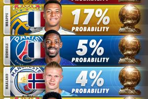 体育资讯09月26日讯 外国媒体SCORE90根据相关机构赔率,列出了2026年金球奖获奖概率,其中巴萨前锋亚马尔以18%的概率领跑。