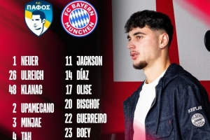 体育资讯9月29日讯 北京时间10月1日凌晨3:00,欧冠联赛阶段第2轮,拜仁将客战帕福斯。今日,拜仁官方公布了本场比赛球队大名单,凯恩领衔锋线,比朔夫、博伊和格雷罗在列。