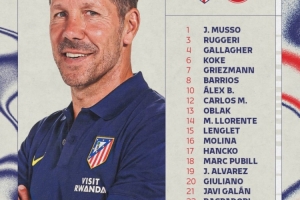 马竞大名单:1-穆索、3-鲁杰里、4-加拉格尔、6-科克、7-格列兹曼、8-巴里奥斯、10-巴埃纳、12-卡洛斯-马丁、13-奥布拉克、14-马科斯-略伦特、15-朗格莱、16-莫利纳、17-汉茨科、18-普比尔、19-阿尔瓦雷斯、20-朱利亚诺-西蒙尼、21-加兰、22-拉斯帕多里、23-尼科-冈萨雷斯、24-勒诺尔芒、28-陶菲克、31-埃斯基韦尔