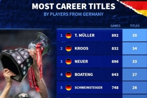体育资讯10月2日讯 德国转会市场统计了德国球员的冠军数量,并列出榜单,随温哥华白浪赢得加拿大冠军杯冠军的穆勒以35冠居首,克罗斯34冠次席。