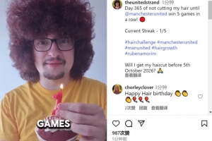 蓄发哥社媒晒出纪念蓄发一周年视频,配文:“不剪头发直到曼联5连胜,已过去365天,当前连胜状态——1/5。”