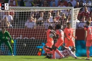 塞维利亚球员投诉手球,随后裁判指了指耳机,示意不是点球。