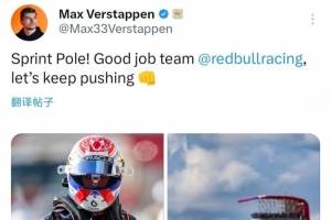 赛后,维斯塔潘更新了个人社媒并写道:冲刺赛杆位!车队做得很棒@红牛车队,让我们继续加油。