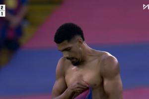 绝杀进球瞬间,阿劳霍激情脱衣庆祝,巴萨全队也陷入疯狂庆祝中。