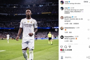 维尼修斯赛后在个人社媒晒出庆祝照片,配文写道:“主场度过美好的周日,皇马加油!”