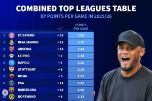体育资讯10月28日讯 《转会市场》更新了本赛季五大联赛球队的场均拿分情况,拜仁、皇马、阿森纳分列前三。