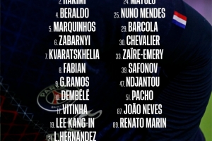 前锋:7-克瓦拉茨赫利亚、9-贡萨洛-拉莫斯、10-登贝莱、19-李刚仁、29-巴尔科拉、47-恩贾恩图