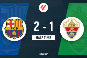 半场结束,巴萨暂2-1埃尔切。