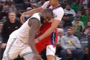 发际线粉事件之一:对阵奇才时杰伦·布朗发际线粉粘到对手白T上