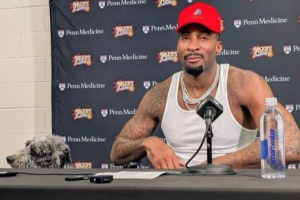 赛后德拉蒙德带着爱犬出席了球队的新闻发布会,并打趣道:“嘿我哥们儿来啦(My dog's here),是真的狗狗(my actual dog)。”